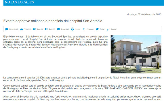 Evento deportivo solidario a beneficio del hospital San Antonio – 07/02/2016 – Diario Debate Pregón El próximo viernes 12 de febrero, en el club Sociedad Sportiva, se realizará un evento deportivo para colaborar con el Hospital San Antonio de nuestra ciudad. Todo lo recaudado tanto en entradas como en la […]