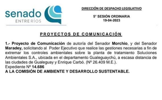 Junto con el Senador del Departamento #Gualeguaychú, Jorge Maradey, presentamos un proyecto de Comunicación solicitando al Poder Ejecutivo provincial que realice las gestiones necesarias a fin de extremar los controles ambientales sobre la planta de tratamiento Soluciones Ambientales, ubicada a escasa distancia de las ciudad de #EnriqueCarbó y #Gualeguay, en […]