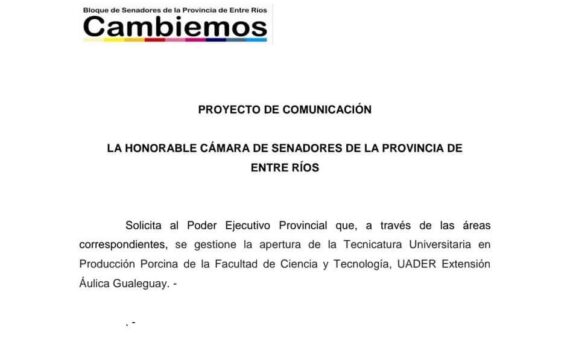 Por medio de un proyecto de Comunicación, solicité al Poder Ejecutivo provincial se gestione la apertura de la Tecnicatura Universitaria en Producción Porcina en Facultad de Ciencia y Tecnología, UADER, extensión áulica #Gualeguay. Dicho proyecto se fundamenta en el crecimiento e importancia que tiene la producción porcina en la zona, […]