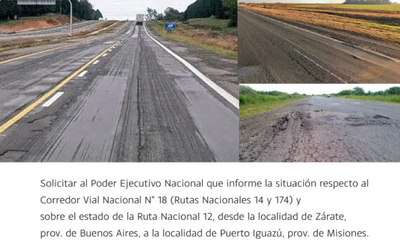 Desde la Cámara de Diputados presentamos un proyecto solicitando informes al Gobierno Nacional para que informe sobre la situación del estado de los caminos que componen el Corredor Vial Nacional Número 18 (Rutas Nacionales 14 y 174) y la Ruta Nacional 12, desde la localidad de Zárate, provincia de Buenos […]