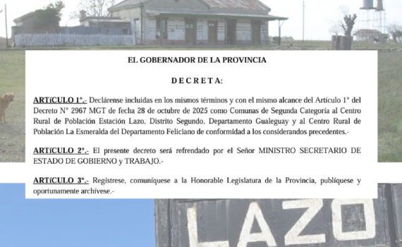 A partir del 31 de diciembre de 2025, la actual Junta de Gobierno de Estación Lazo pasará a ser Comuna, dentro de los alcances de la ley 10.644. Esto fue establecido a través del Decreto 3511/2025 del Ministerio de Gobierno y Trabajo, el cual incluye a Estación Lazo en las […]